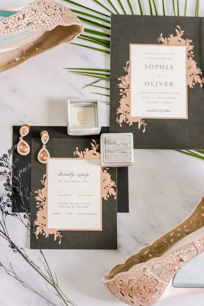 Venue: The West Events, Planning & Design: Elegant Affairs by Design, Photography: Amanda Zab Photo, Cake: Tampa Bay Cake Company, Calligraphy: Inky Fingers Key West, Dress & Tux: All Brides 2 Be, Florals (ceremony arch): Save the Date Florida, Hair & Makeup: Adore Bridal Hair and Makeup, Invitations: Minted Weddings, Rentals (table, chairs, couch): So Cool Events, Table Design (flatware, cutlery, drink ware, candles): Set and Styled.